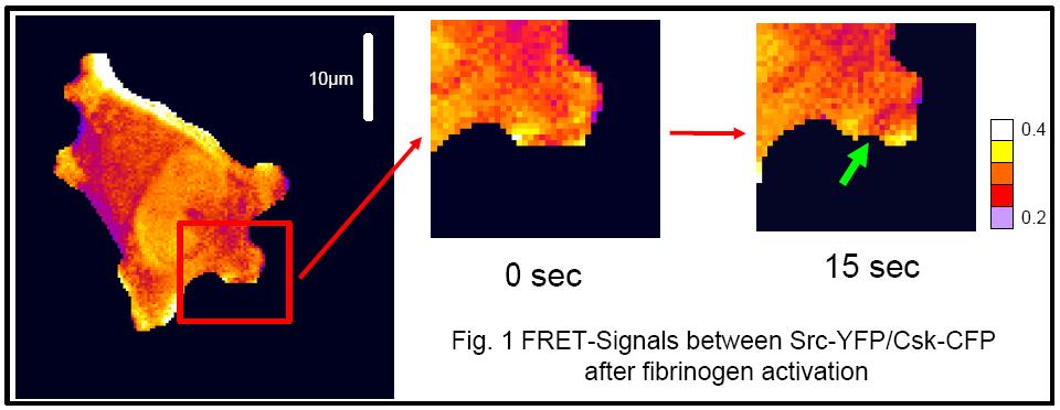 Imaging of platelet adhesion signalingPlatelet adhesion to fibrinogen is an important event in wound healing and cardiovascular medicine. Adhering platelets generate `outside-in’ signals from the adhering integrin protein inward into the cell. This is an under-explored facet in platelet signaling. Activated integrins cause profound cellular cytoskeletal rearrangement and spreading due to signalling of Src-kinases and multiple downstream response proteins. One of these proteins, Csk, inactivates Src. Previously, it has been shown biochemically that Csk forms a complex with the aIIbß3 integrin and Src. We have now elucidated and observed the cellular dynamics of the Src inactivation by Csk by live cell FRET microscopy. This result is a first step in understanding how the ‘outside-in’ signal transfers throughout platelets.